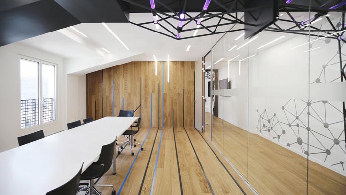 會議室的設計:此處采用的是加長版的會議桌,相信大家想起會議都會感覺十分枯燥,設計師也注意到這個問題,故此在設計中盡量減少多余的元素,將一切都融入于無形,木板之間的間距、射線在陽光的照射下,好似那突破突破壁障的一絲絲零星想法。