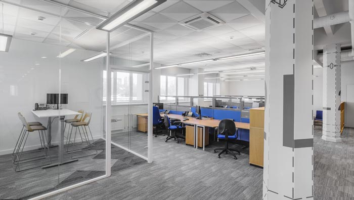 辦公區域的設計:此處是其中一個部門的辦公場地,設計師在辦公工位的設計中,將每一步部門按照不同的屬性分割在空間的每一個角落,這樣做好的好處就是保證為每一個員工都提供優質的辦公工位,不會出現人員扎堆的想象發生,即保證了空間的通暢也為每一個部門都保留了自己的空間。
