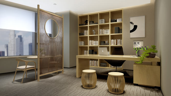 總經理辦公室設計:設計師在設計的時候將其安置在一個獨立的空間之中,窗戶以雙玻來隔斷外界的空間,讓總經理在這樣的空間中可以安心工作,不斷的提升自己、提升自己的心境。