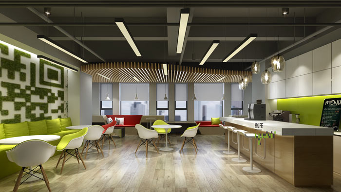 網絡辦公室茶水間設計:空間很大一部分被用來作休息之用,設計師希望員工可以在這里遠離喧鬧的工作、與快速發展的社會進程,在此地回歸自己、找回自己,為下一步的進步積蓄能量。