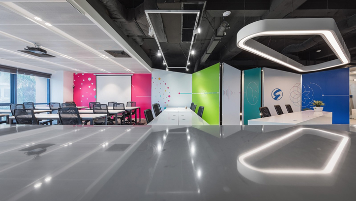 會議區的設計:在此處設計中,設計師采用橫豎兩種設計手法,分別打造了大會議區與小會議區,設計師的目的就是希望將功能區域更加細致化,此處的設計也同樣采用角度的問題來解決,如此一來既滿足企業對于大會議的需求,也滿足企業對于小會議室的需求,真可謂是一舉兩得,同時也有意外之喜在等待著我們。