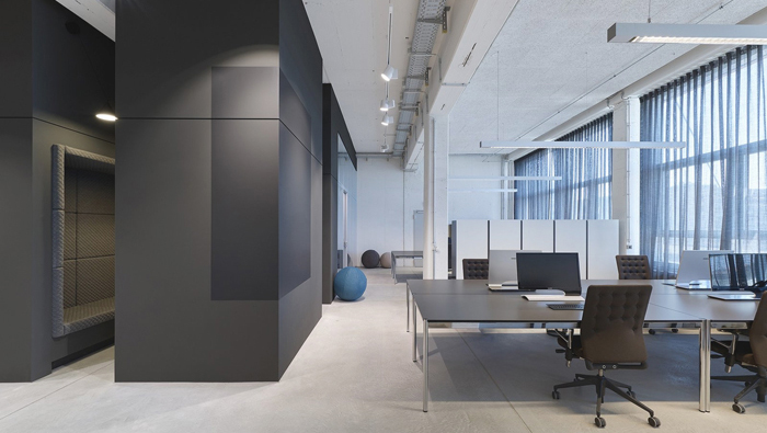 辦公區域的設計:開放式的辦公區域是此空間給人的第一感覺,設計師在設計的時候,為每一個員工都預留了足夠的活動空間,兩邊的儲藏柜隔離了與周邊空間的聯系,但是又是隔而不分,設計師需要的就是一個完整的整體,在整體之下去拓展一個個的小空間。