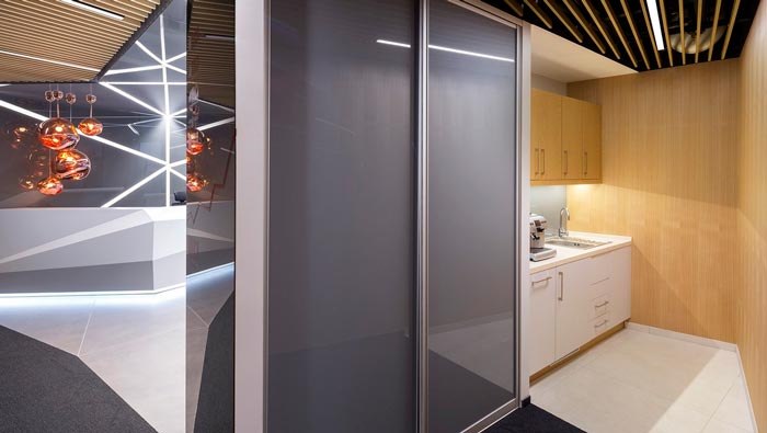 獨立茶水區的設計:此處位置的設計十分巧妙,設計師將其安置在接待區域與辦公區域之間,這樣做的好處就是一方面可以供接待客戶之用,另一方面可以方便內部員工使用,這樣設計的好處就是無形中加快辦公的效率,同時將此處空間合理的加以利用,以此增加空間的多元化,設計師的目的就是讓辦公更加方便。
