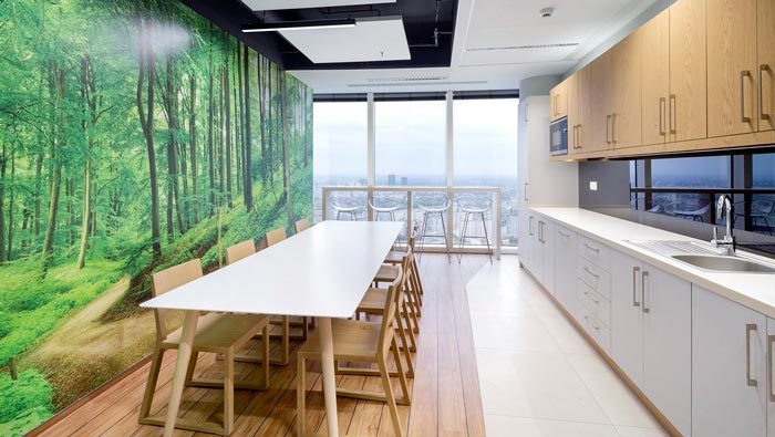 茶水間的設計:此處位于一個獨立的空間之中,與休息空間相互結合在一起,設計師這樣做的目的,就是希望給員工打造一個減壓的空間,在這里員工可以遠離辦公帶來的壓力,帶來暫時的緩解,在這里員工可以相互交流、相互攀談,在這里看看風景也不失為一個好的主意,設計師要做的就是讓員工在這里可以忘卻煩惱。