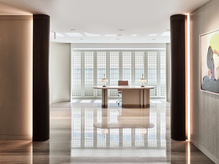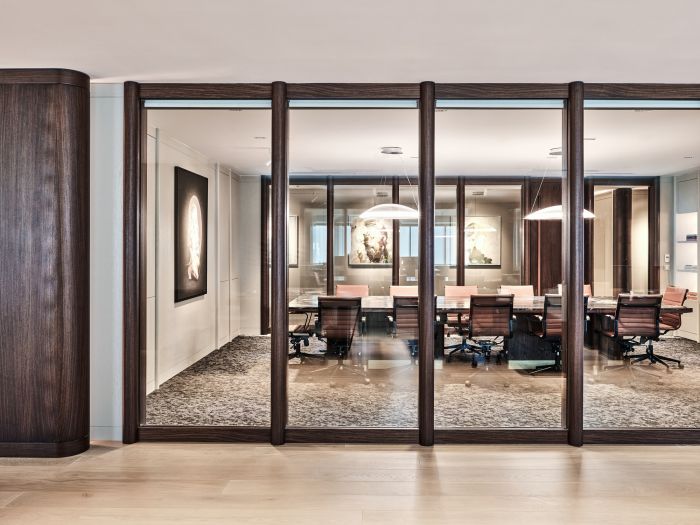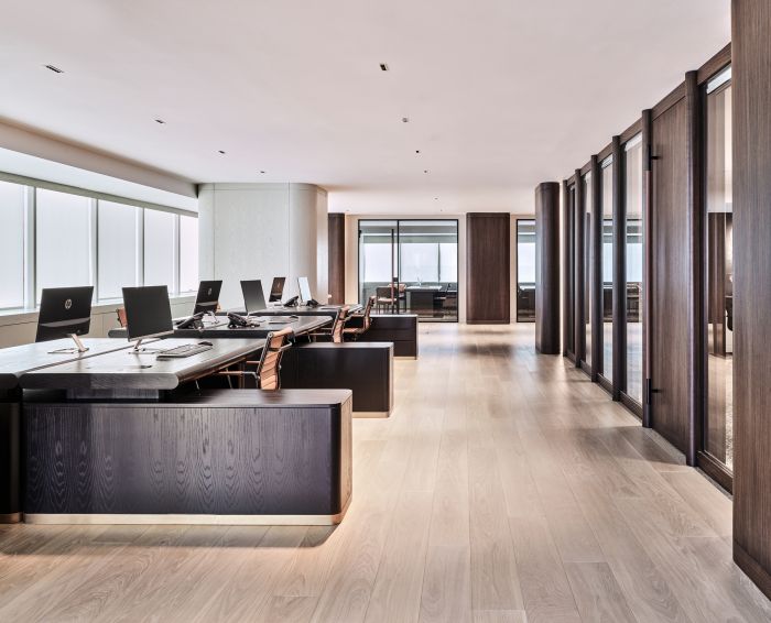 所有的辦公室都是開放式設計,透明玻璃門劃分了工作區域。從接待區到工作區,木材材料逐漸使用,所以整個辦公室的調色板以米色和棕色為主。該項目的主要棕色色調以木質元素和 大理石細節為特色。