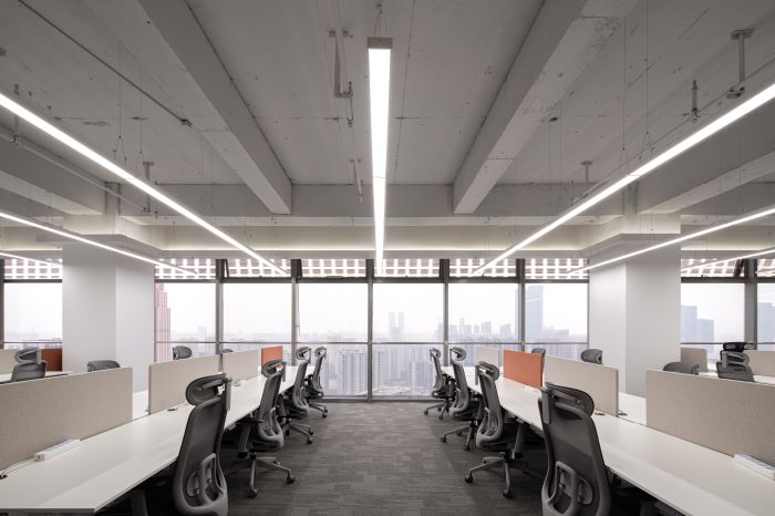 空間的一角設置有員工休息區,員工可以在這個空間里休息和討論,桌椅的不同組合讓這個空間也可以作為大型培訓的場所。空間內有一個橙色的V字,是對空間原有建筑的延續,使得整個空間靈動。