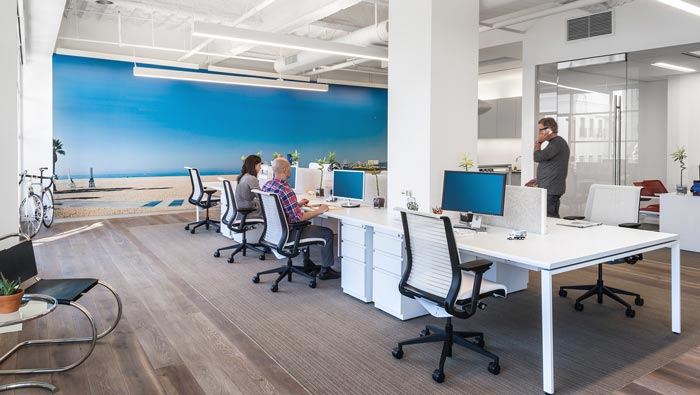 辦公區域的設計:設計師在設計的時候,將空間的柱子抱在辦工桌之內,這樣設計的好處就是化不利為有利,將柱子的弊端有效的加以規避,在設計師看來設計本身就是對空間的缺點加以彌補,一點小小的創意改變了此處的屬性,辦公桌團結在柱子四周有團結一體的正向象征。