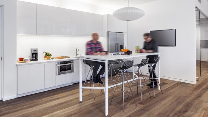 茶水間的設計:設計師在設計的時候,利用空間結構的優勢,將茶水間通過成組式茶水臺、茶水柜進行包裝,同時在色彩上采用白色做為主色,因為白色自身有向外擴張的特性,設計師希望通過此種屬性在一定程度上影響空間的視覺感受,讓空間在視覺上加以延伸。