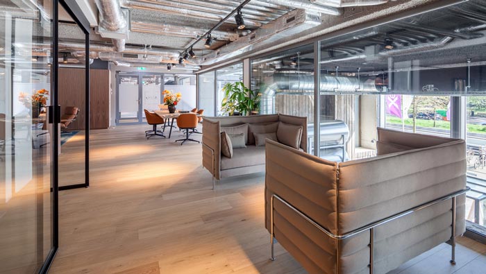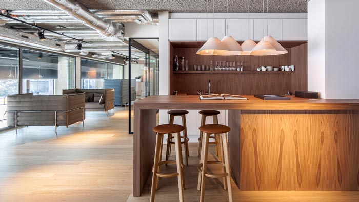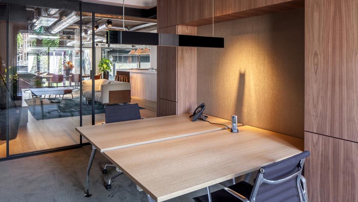 通話空間的設計:由于企業的工作需要,打電話是工作的日常所需,故此設計師也將其列入設計的重點,隔音門關起來之后,為員工打電話營造了一個安靜的空間,在這里與外界隔絕,適合員工在這里打電話,同時此處在閑暇之時,也可以滿足企業各種不同的需要。