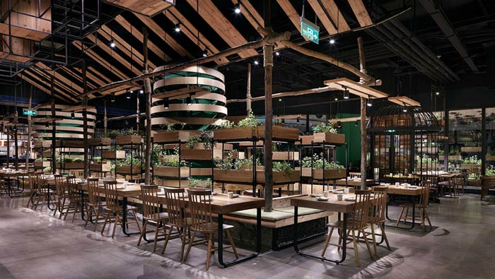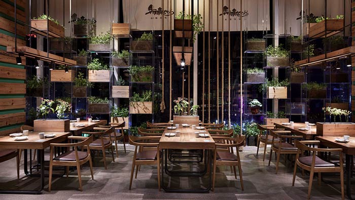 特色生態(tài)餐廳餐區(qū)設(shè)計:蔬菜陳列架在空間隨處可見,設(shè)計師把陳列架量化,成為空間的最小單元,這樣易于隨著季節(jié)的更換及搬運,空間四周滿滿的種植區(qū),賦予空間生命力。