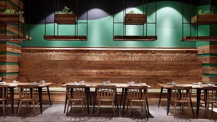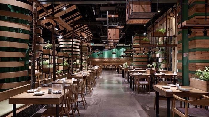 特色生態(tài)餐廳餐區(qū)設(shè)計:空間中的各類蔬菜,有的結(jié)合柜臺、有的連接天花板、有的長滿墻面,各式各樣的蔬菜,為空間增加了活力,也成為餐廳的特色之一,吸引客戶慕名而來。