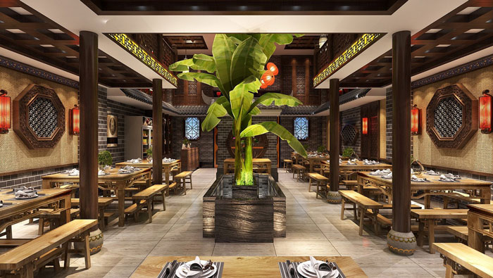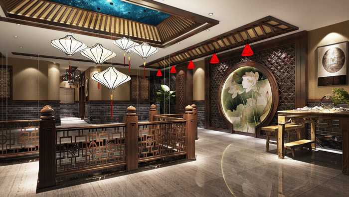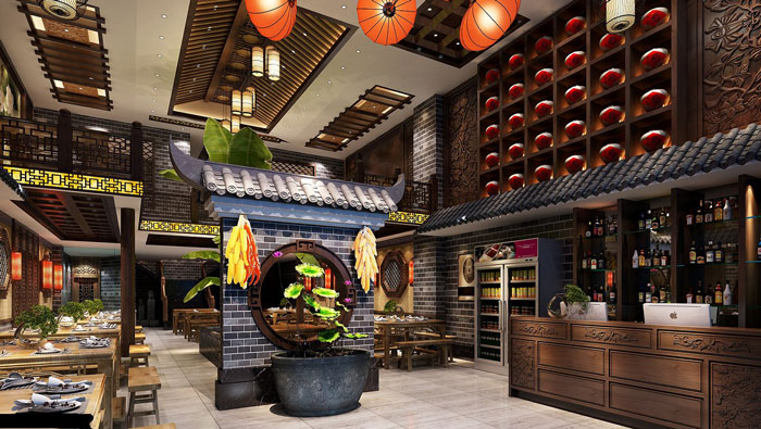 中式川菜館大廳裝修設(shè)計(jì):大廳給人的感覺(jué)好似回到過(guò)去,但是又稍有不同,設(shè)計(jì)師在中式設(shè)計(jì)的同時(shí),也加入了很多現(xiàn)代元素,目的就是希望營(yíng)造一個(gè)古代、現(xiàn)代融合的空間。