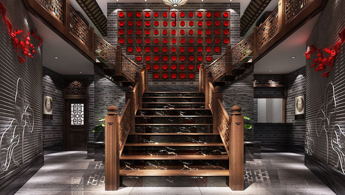 中式川菜館樓梯裝修設(shè)計(jì):一分為二的木制樓梯,相信現(xiàn)在很少見(jiàn)到,這樣的樓梯一來(lái)是為了更好的分流,二來(lái)是起到連接空間的作用,客戶在這里感受到濃郁的古式風(fēng)格。