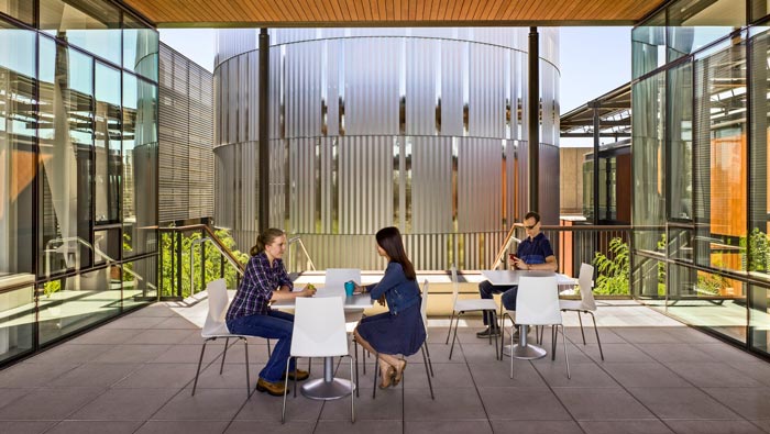 廠區的設計:此處的風景是一位室外設計師所設計的,在設計中兩位設計師做了全面的溝通,這樣做的目的就是希望室內、室外可以融為一體,室外設計師也受到業主的感染,在設計中加入了各種節能設計,讓整個空間宛如一體。