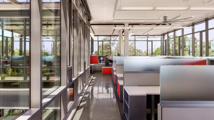 辦公區域的設計:通過上圖可以看出此處空間,是一個半開放、半封閉的辦公空間,設計師這樣設計的目的就是希望,給每一個員工留下足夠的私人空間,辦公區域四周都是透明窗戶,這樣可以保證陽光可以時時照入室內,墻沿處設計師采用了進門的折疊遮光板,將強光變為柔光給每一個人溫暖的感受。