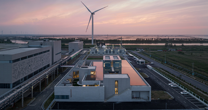這是一個新能源材料行業的工業廠區的設計案例。廠區建筑以水為主題,水上的漣漪仿佛叩響生命與物質的存在邊界。生產車間的發酵恒溫水排走之前,在辦公區屋頂匯成淺池。