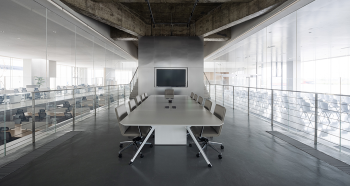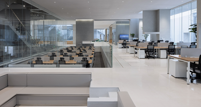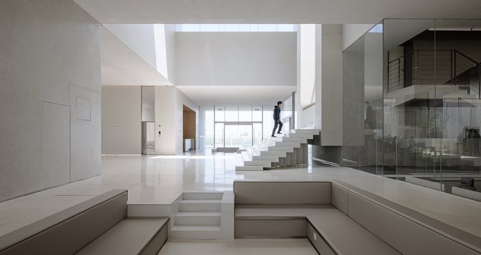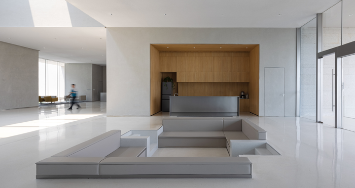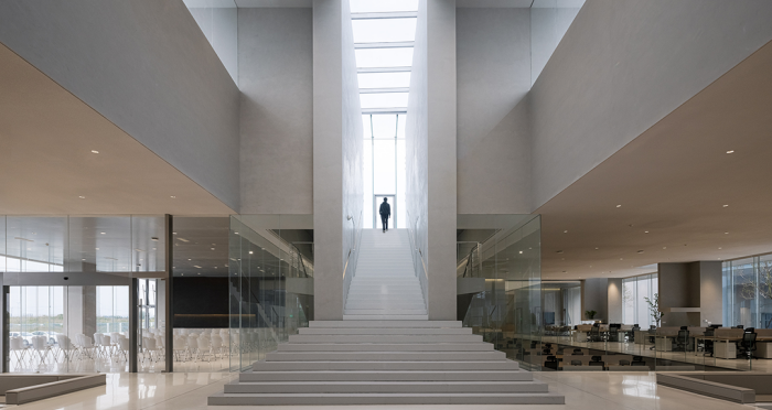 展廳、會客廳和行政會議室凸出水面,辦公區、會議室、員工食堂、廚房和多功能廳等大部分空間沉在水面以下,墻柱等構筑物和房間像細胞器一樣自由分布,具有極好的漫射采光。