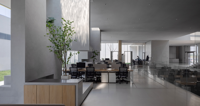 建筑被抬高1.2米,在庭院中額外覆土,可以盡快種植樹木。溫度控制則采用工廠車間恒溫水循環,設置地出風,充分利用地面樓板下的空腔,釋放天花高度。
