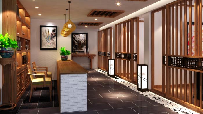 中式茶餐廳引導(dǎo)區(qū)設(shè)計:此處正對包廂,讓無微不至的服務(wù)體現(xiàn)在每一個細(xì)節(jié)當(dāng)中,之所以在這里安置吧臺,是避免出現(xiàn)服務(wù)死角,設(shè)計師希望讓客戶體會到無微不至的服務(wù)。