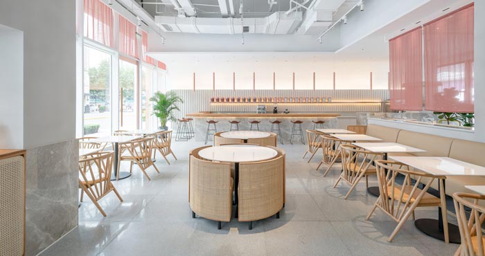 本次為茶餐廳設計項目,茶餐廳位于一個商業綜合體的室外一層,設計師希望創建一個舒緩的流線,引導人進入到一個愜意的氛圍空間。
