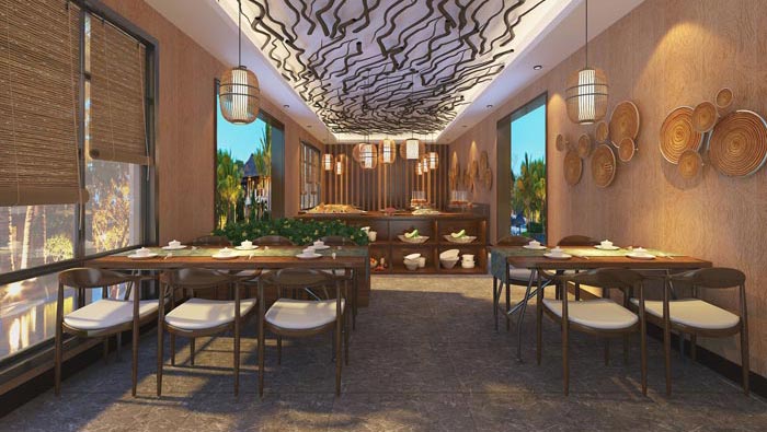 餐廳的設計:當顧客進入酒店之后,首先迫切希望的一定是飽餐一頓,這也是人最初的需求,設計師在餐廳的設計中,將餐廳的位置定于酒店的中央,也就是滿園花色的正中央,讓顧客在進餐的時候,可以隨時隨刻欣賞到美麗的景色,秀色可餐也不過如此呀。