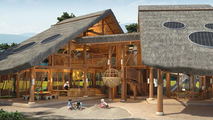 酒店后院的設(shè)計:設(shè)計師在此處開辟出一塊供小孩子玩耍的場所,經(jīng)過設(shè)計師的調(diào)查發(fā)現(xiàn),旅游者大多都會帶著自己的孩子,故此此處就是為了滿足孩子的玩耍,讓孩子在這里盡情的玩耍,去體會與自然之間的關(guān)系,讓被鋼筋水泥困住的孩子們,可以去追尋自然地美。