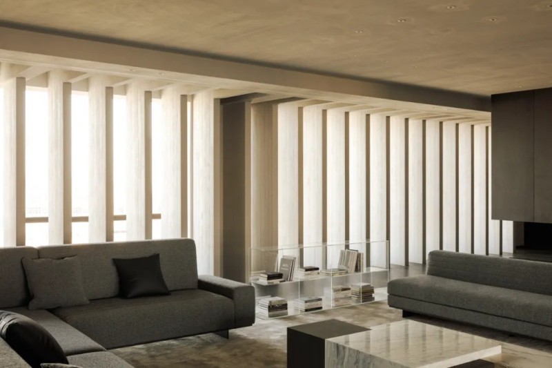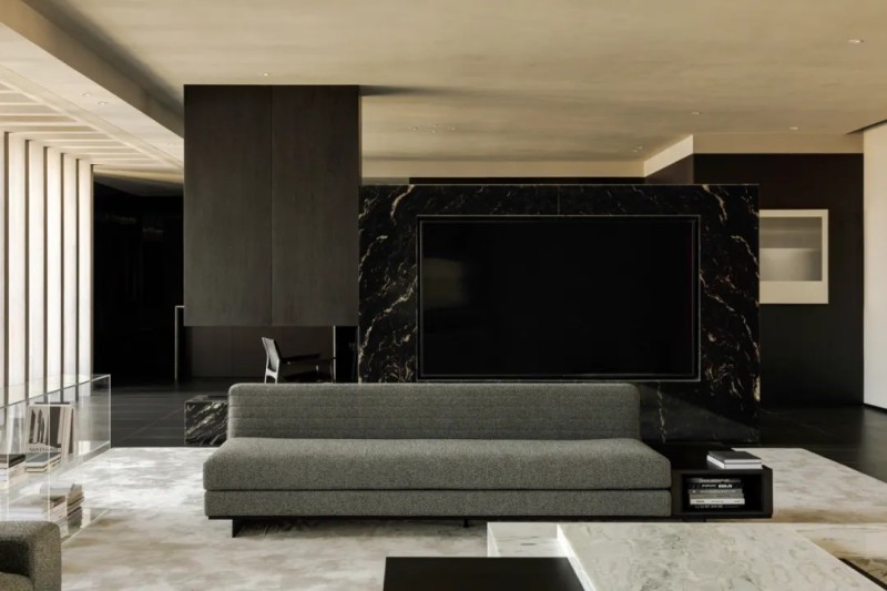 整體材質(zhì)幾乎是藝術(shù)微水泥,肌理與色彩給予更沉浸式的簡(jiǎn)約素樸,對(duì)撞局部的仿銅與大理石,凸顯空間氛圍的厚實(shí)與精細(xì),也在簡(jiǎn)約中增加豐富性。