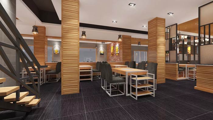 本次為魚火鍋店裝修設計方案,在實地考察的時候,了解到整個空間是兩層建筑,在設計中一樓主要由前臺、開放式就餐區構成,二樓主要由包間、以及兒童玩耍區構成,空間地面采用黑色仿古磚,墻面采用三種色彩的材質與小紅磚,讓客戶仿佛在記憶中中老房子里就餐。