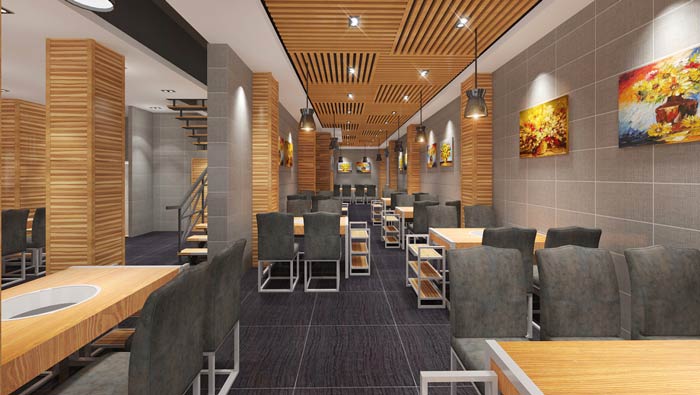 魚火鍋店一樓餐區設計:四人桌、六人桌是一樓餐區的主要組成部分,這里的設計目標十分明確,就是為每一桌的客戶,在滿足需求的同時,為他們營造一個優質的就餐環境。
