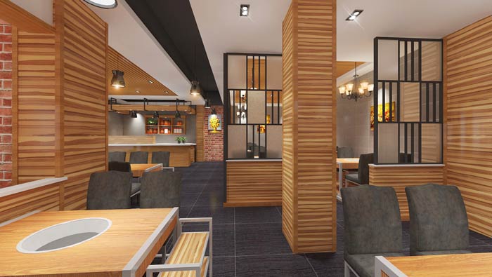 本次魚火鍋店裝修設計方案講解到此結束,設計師在本次火鍋店設計中,空間地面采用黑色仿古磚,墻面采用三種色彩的材質與小紅磚,讓客戶仿佛在記憶中中老房子里就餐。