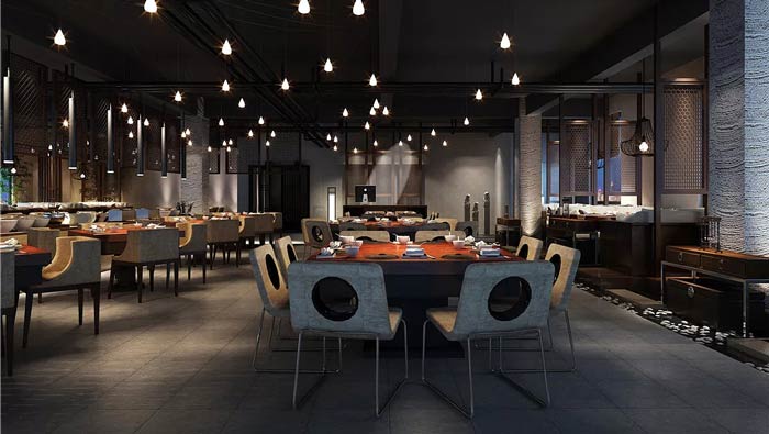 肥牛火鍋店一樓餐區設計:在開放式的空間之中,設計師將餐桌有序的安置在空間之中,既要保證空間的暢通,又要保證相互之間不受影響,安靜的氛圍讓客戶吃的安心。