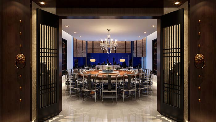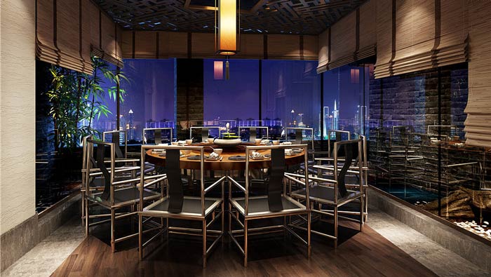 肥牛火鍋店中包廂設計:空間可以容納10個人,室外景色被很好的引入室內,就餐人員可以邊吃飯、邊欣賞美景,一舉兩得,讓客戶喜歡這里、愛上這里。