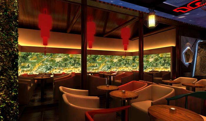設(shè)計師裝修設(shè)計的酒吧,裝潢考究,寬敞周正,古香古色,氣度不凡,院子用玻璃封頂,通透豁亮,還能登高觀景乘涼。