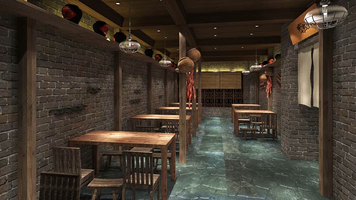 特色燒烤店餐區設計:這里給人的第一感覺就是安逸,這里所說的安逸是心靈的安逸,在這里沒有了時間的概念,設計師希望讓客戶在這里體驗日出而作、日落而息的美好生活。