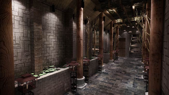 特色燒烤店過道設計:中式講究的就是人與自然、空間與自然之間的關系,過道有柱子、荷葉、小樹枝、燈籠,無不在訴說著這樣的關系,這里沒有繁雜,有的只是安靜、愜意。