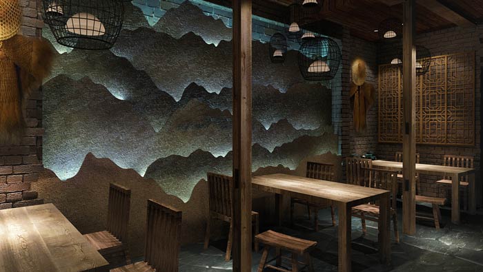特色燒烤店墻畫設計:墻畫是以山水畫為背景,這樣做是為了將自然很好的融入室內,山巒起伏讓客戶仿佛置身于小村莊一樣,讓客戶享受到不一樣的生活方式。