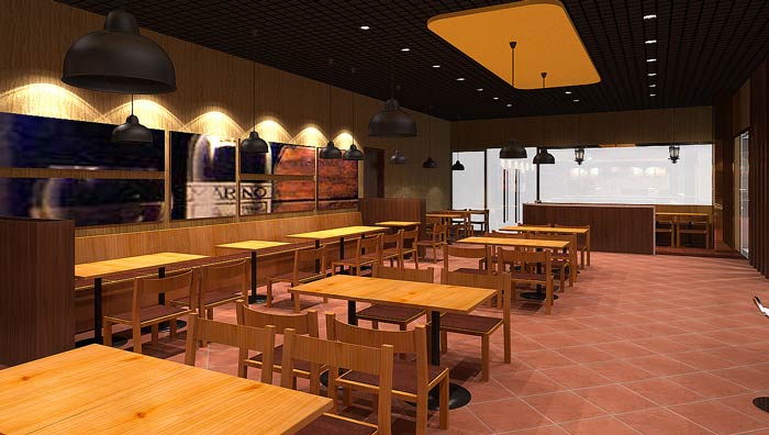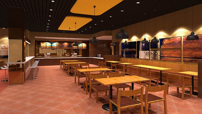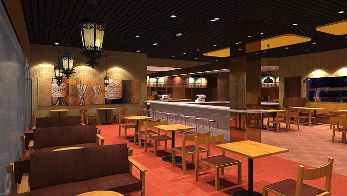 快餐店餐區裝修設計:暖色系的燈光、暖色系的色彩設計,給客戶一個穩定的就餐環境,這里沒有用桔紅色,是希望給客戶一個安定的環境,業主不希望因為色彩的刺激,造成客戶吃快食。