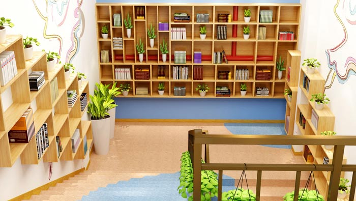 舞蹈培訓機構一樓前廳設計:一樓前廳主要是圖書銷售、購買與閱讀,在這里有著各式各樣的書籍,孩子們可以在這里閱讀,柜子的設計,打破傳統的中規中矩,柜子中藏著休息區域,讓空間更有體驗感。