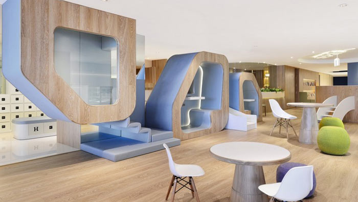 兒童教育培訓機構接待區設計:說是接待區其實也兼顧洽談與休閑,在設計中設計師在同一個空間內,設計并放置了兩套家具系統,目的就是滿足兒童和成人各自的需求。
