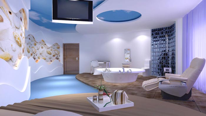 海底客房的設計:在此次戀人們仿佛變成了無憂無慮的魚兒,去探險那未知的海底世界,在這里他們會見到千奇百怪的海底生物,設計師希望讓他們,在這里來一次十分有意義的旅行,以此填補人們對于海底世界的無知,給戀人們一個美好的旅行,屬于兩個人之間的秘密。