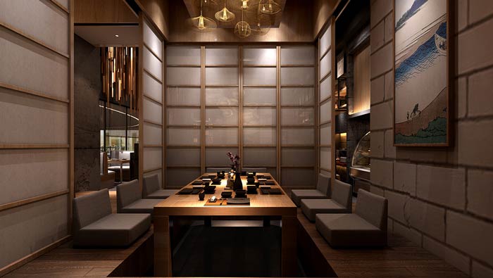 日式料理餐廳包廂設(shè)計(jì):餐桌位于一個斷層當(dāng)中,這樣客戶在盤坐的時候,腳也可以往下伸,這符合國人的習(xí)慣,這就是餐廳設(shè)計(jì)本土化的最好見證,只有如此才能夠相互互補(bǔ)。
