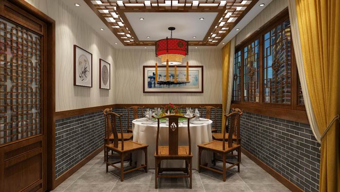 農家私房菜內包廂設計:內包廂相對于外包廂相對小一些,這里可以容納8個人,內部中式、外部現代,讓人在古代、現代之間感受到生活的變換,在這里享受生活的美好。