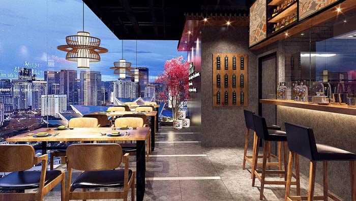 特色小吃店陽臺裝修設計:邊享受美食,邊欣賞城市的美景,兩者相加讓客戶感受到不一樣的感受,透明的窗戶讓客戶在室內,同樣可以感受到室外的景色,室內、室外在這里重合。