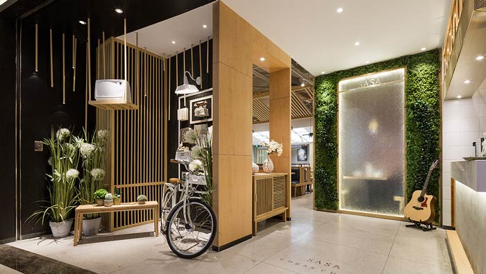 小吃店進門區裝修設計:盆栽為空間帶來了綠色,自行車為空間帶來了行動力,吉他為空間帶來了音樂氣息,一切的一切都旨在改變人們的觀念,讓客戶在這里享受傳統美食。