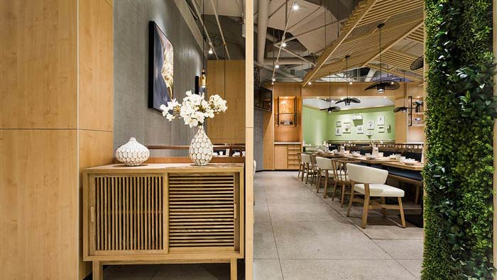 小吃店店面裝修設計:綠色是空間給人的第一感覺,素雅是空間給人的第二感覺,設計師就是要改變人們,對傳統小吃臟亂差的固定形象,在這里傳統小吃被賦予了新的生命力。