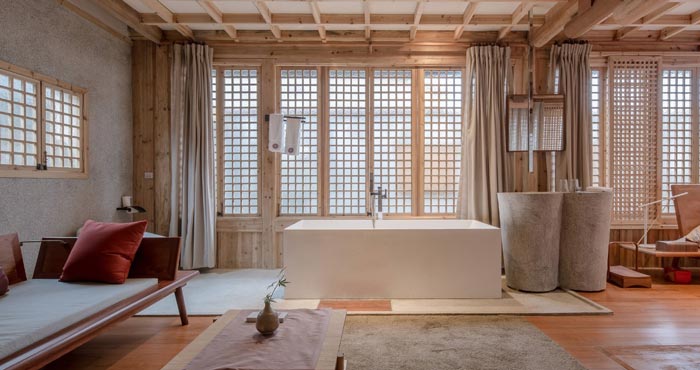 本次為古鎮(zhèn)鄉(xiāng)村民宿改造項目,這是兩棟三合院,一共400平米, 重新翻修,材料全部用的是木頭,打造一個隨性、寧靜、舒心的居住環(huán)境。