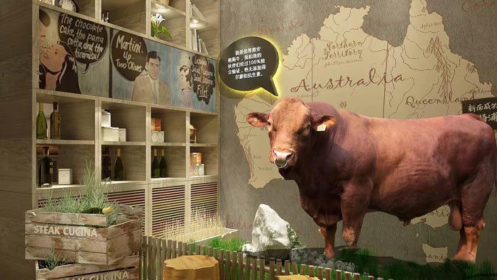 西餐廳墻畫裝修設(shè)計(jì):優(yōu)等黑安格斯牛,背后的地圖樣式告訴客戶,它們來自于何方,青草、無污染的環(huán)境,告訴客戶它們都是天生地養(yǎng),沒有經(jīng)過任何人工的培育。