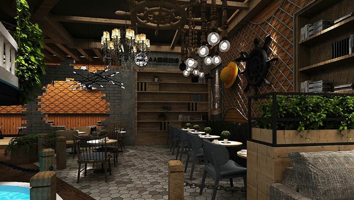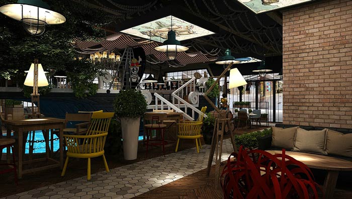 主題餐廳海盜船設(shè)計(jì):船體漂浮在水面上,客戶在來回晃蕩的船體上就餐,讓客戶感受到在區(qū)別于陸地的感覺,空間的裝飾讓人感覺,好似回到了海賊王時(shí)代。
