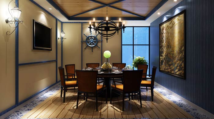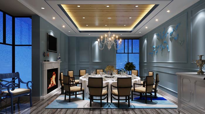 主題餐廳包廂設計:這里給人的第一感覺就是安靜、舒適,在嘈雜的都市中,一個安靜的就餐環境成為難事,在這里設計師借助海洋的寧靜,打造安靜、舒適的空間環境。