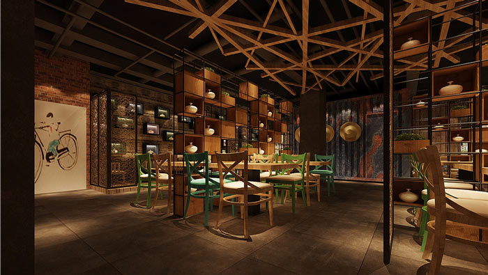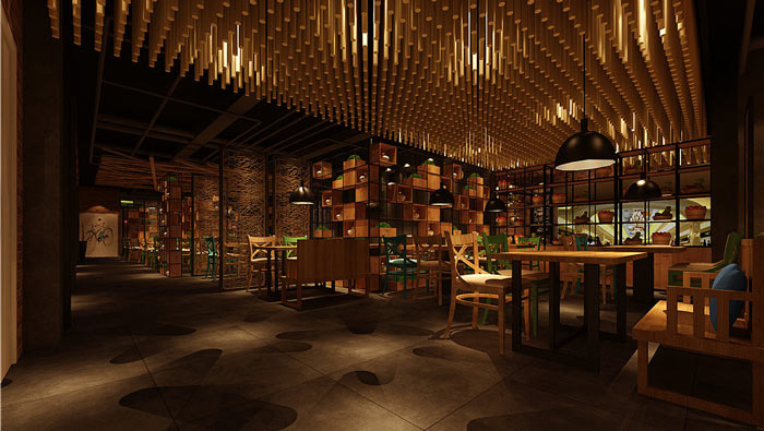 主題餐廳裝修設計:多根木條組成的天花吊頂極為壯觀,由不規則的木材特制的空間隔斷也極具新意,給人以強烈的視覺沖擊。